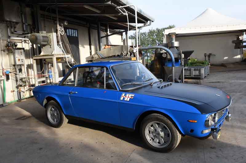 L’auto abbinata al Frantoio è la mitica Fulvia coupè 1300 “Montecarlo” seconda serie del 1972. Ha avuto due proprietari e sfoggia il più raro colore azzurro Francia.La vittoria della Fulvia HF al Rally di Montecarlo del 1972 spinge la Lancia a creare una versione speciale per celebrare il prestigioso risultato. Nasce così la Fulvia Coupé Montecarlo, caratterizzata dall’assenza dei paraurti e da cofano e baule in nero opaco, come la vincente HF n°14 di Munari e Mannucci. La Fulvia Coupé, nata dalla sapiente mano di Piero Castagnero nel 1965, dopo diverse evoluzioni delle vincenti versioni da corsa denominate HF raggiunge l’apice della popolarità nel gennaio del 1972, quando Sandro Munari e il fido Mario Mannucci conquistano il Rally di Montecarlo.