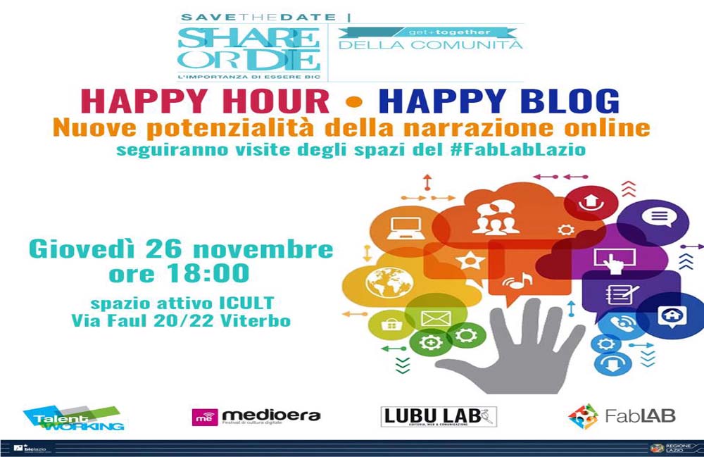 Questa sera dalle 18:00 allo Spazio Attivo Icult Medioeraa parlerà di blog e di narrazione aziendale.Verranno rappresentati alcuni casi di successo e spiegato perché è così importante per un’azienda raccontarsi. Giovedì 26 novembre alle ore 18.00 , presso lo spazio ICult, di Via Valle Faul 20-22 sarà di nuovo Happy Hour:Happy Blog, questa volta, l’appuntamento sarà dedicato ad esplorare le potenzialità della narrazione online e, nello specifico, si parlerà di blog.