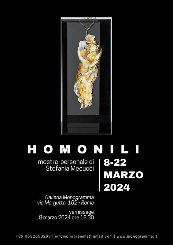 Con Homonili, l’artista Stefania Mecucci, originaria di Viterbo e residente a Roma, l’8 marzo mette in mostra il suo ultimo lavoro sull’identità umana. Una “monilizzazione” degli umani di cui tenta una riproduzione della forma. La galleria Monogramma accoglierà via Margutta n. 102 una collezione di ventisei pezzi per una esposizione personale che inaugura il giorno della festa della donna e resterà visitabile fino al 22 marzo nella strada del centro capitolino notoriamente dedicata all’arte. I materiali e le tecniche attraverso cui l’autrice si esprime rappresentano la trasparenza, più o meno vacante o utopistica, attraverso la resina, la preziositàcelata all’interno di ciascuno, attraverso i metalli utilizzati come la foglia d’oro e d’argento, l’instabilità del sentirsi tutti appesi ad un filo, simboleggiata dai fili di sospensione installativa di alcuni manufatti, l’attaccamento alla terra, tramite la terra cotta e l’esercizio dello sguardo a creare la tridimensionalitàmediante uno sketch, un bozzetto, un frame di un’immagine onirica ancora più grande, infine lo slancio materico dello smalto che fuoriesce dal piano della tela per comunicare una sua dimensione esistenziale che prende forma e vita nella lucentezza di un linguaggio discreto, sempre piuttosto monocromatico.