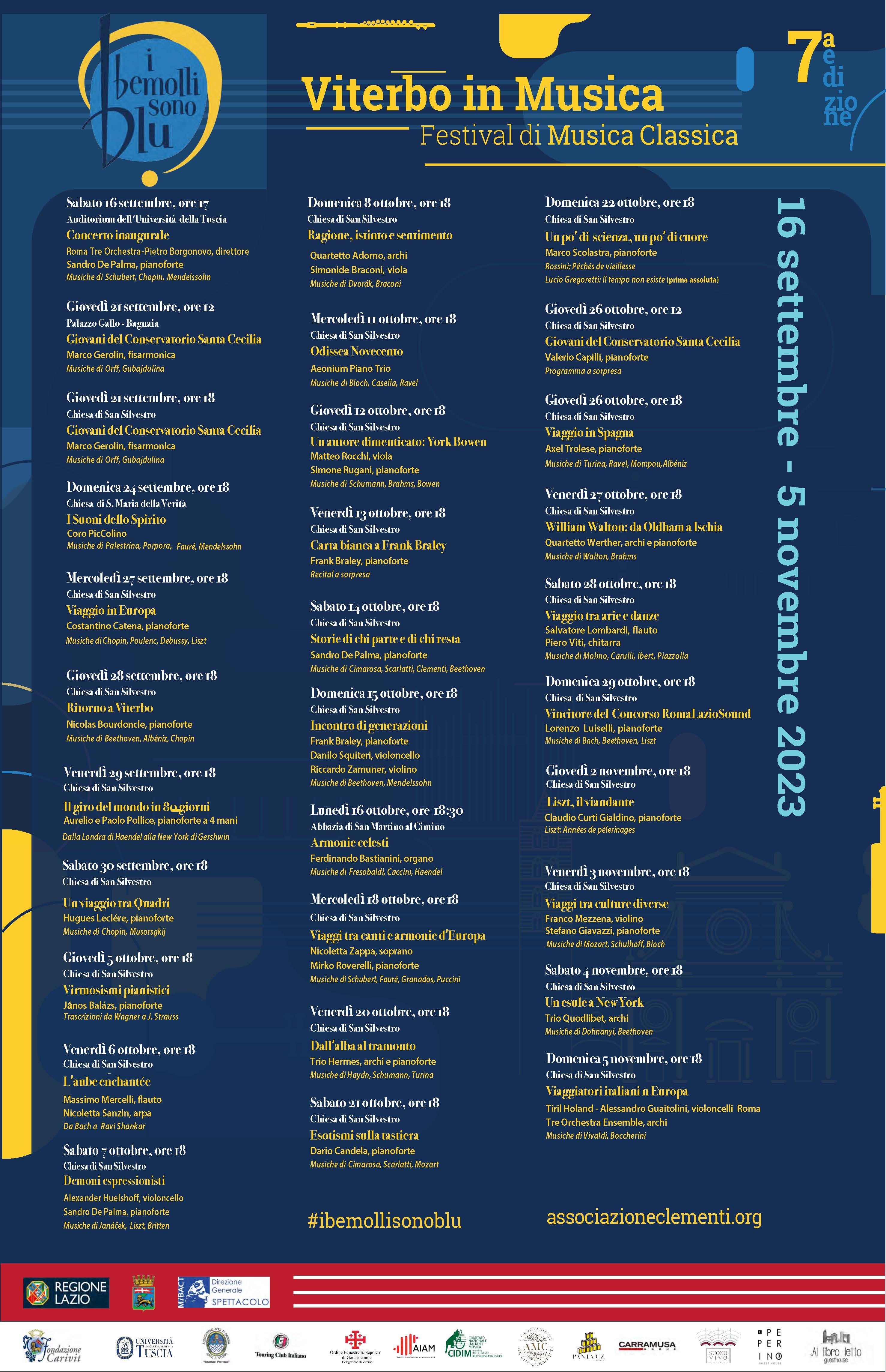 L’equinozio d’autunno darà il via alla settima edizione del Festival “I Bemolli sono Blu-Viterbo in Musica” (16 settembre-5 novembre 2023). L’amore per la Musica, la Bellezza dei paesaggi, la Storia che avvolge Viterbo e il suo patrimonio culturale hanno contribuito a confermare la città dei papi, vero genius loci, quale luogo ideale dove continuare a svolgere il prestigioso festival di musica classica “I Bemolli sono Blu”, promosso dall’Associazione Musicale Muzio Clementi e ideato e diretto dal M. Sandro De Palma. Festival che quest’anno giunge al traguardo della settima edizione, grazie agli interpreti di fama mondiale che si sono susseguiti negli anni, all’apprezzamento del pubblico e ai commnenti benevoli della critica.