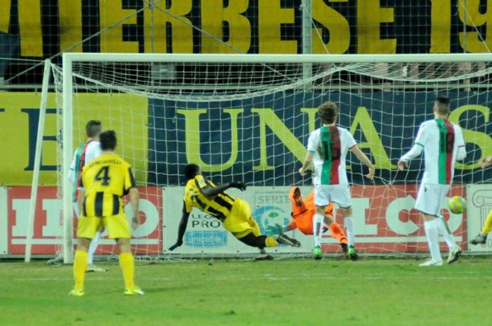 VITERBO – Ci voleva una super Viterbese per ribaltare in appena quarantacinque minuti l’immeritato svantaggio maturato sotto la neve alla fine di un primo tempo dominato. La squadra di Calabro, ancora una volta felici le sue intuizioni in campo nel corso della gara, ha dominato i rossoverdi di Calori e solo uno strepitoso Gagno ha evitato alle fere una clamorosa goleada al passivo. Viterbese determinata, aggressiva, padrona del campo e che non si è arresa dopo l’errore dal dischetto di Pacilli fermato dal super portiere umbro. La squadra di Calabro ha continuato a macinare gioco, creare occasioni in quantità industriale prima di piazzare con Polidori il primo letale colpo alle speranze rossoverdi. Ci ha pensato poi Bismark, espulso nelle battute finali, a firmare il sorpasso decisivo nel finale del primo tempo supplementare. I due tecnici cambiano rispetto al primo tempo, ma il trend del match rimane sempre a senso unico con una Viterbese vogliosa di regalare ai propri tifosi ed alla società un successo attesissimo ed al tirar delle somme strameritato. MPV Alessandro Polidori che ripete l’eccellente prova di tre giorni fa contro il Siracusa, ma grande serata anche per Jari Vandeputte uomo ovunque nello scacchiere di Calabro. Una sfida stradominata dai gialloblù che approdano ora agli ottavi di finale che giocheranno ancora al Rocchi contro il Teramo pregustando magari già una doppia sfida nei quarti contro il Pisa che si è sbarazzato facilmente del Pontedera.