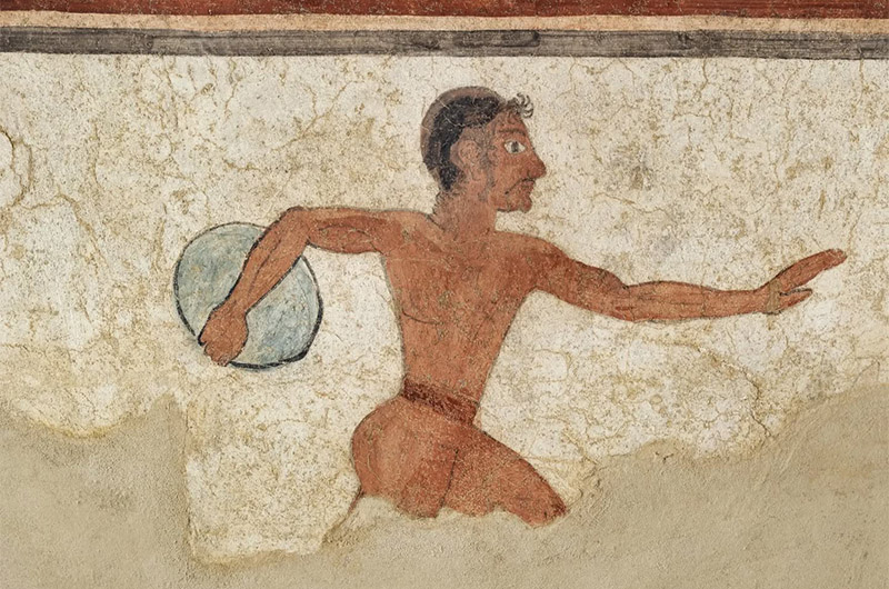 Questo capolavoro dell’arte etrusca, portata alla luce nel 1958 nella necropoli dei Monterozzi di Tarquinia da una équipe della Fondazione Lerici del Politecnico di Milano. Un complesso unico di dipinti a tema sportivo, in cui vediamo atleti gareggiare con spirito competitivo come se fossero con noi oggi, sotto i nostri occhi pieni di stupore: un incontro di pugilato, una corsa di carri, il lancio del disco e la scena del sanguinoso gioco del ℎ, lo spettacolo di tipo gladiatorio praticato dagli Etruschi che vedeva un personaggio incappucciato difendersi da un cane feroce.