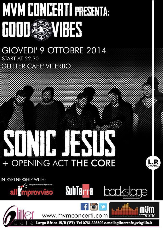 A dare il via alla stagione giovedì 9 Ottobre 22:30 presso il Glitter Cafè, Largo Africa 15, Viterbo i Sonic Jesus in una serata in collaborazione con Allimprovviso e Subterra Label. Ad aprire la serata i The Core.