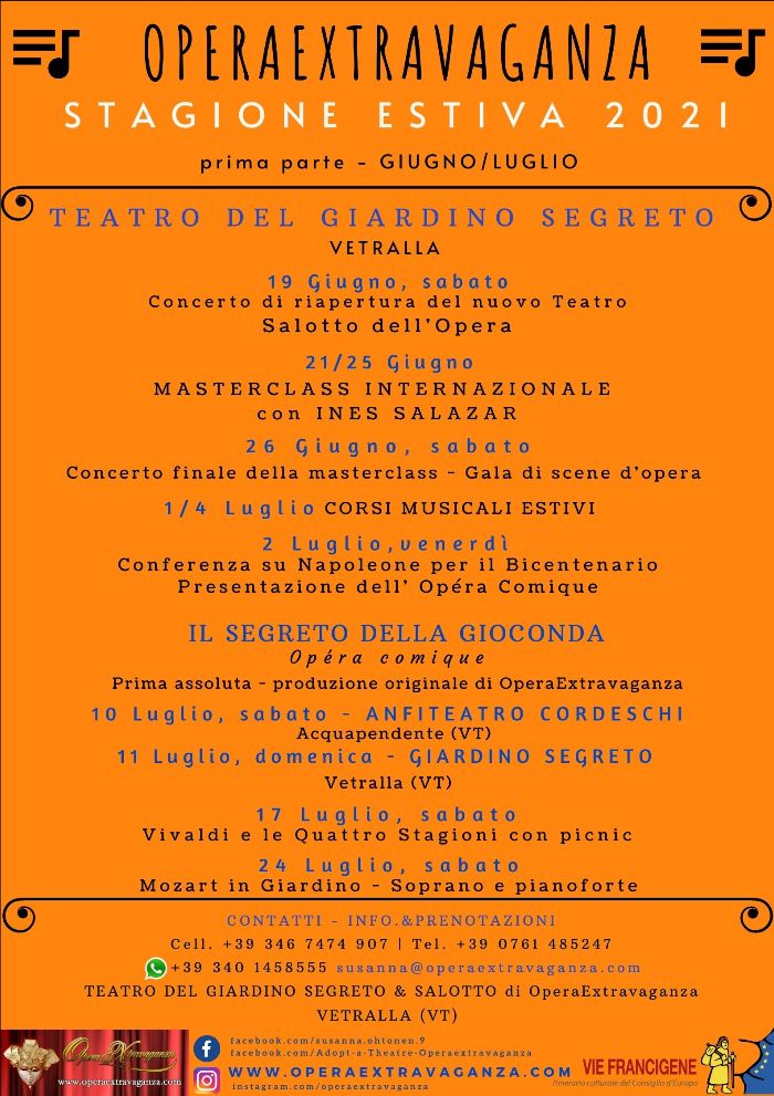 Sabato 19 giugno alle ore 21.00 si riapre la stagione estiva di OperaExtravaganza nel Teatro del Giardino Segreto all’aperto a Vetralla.