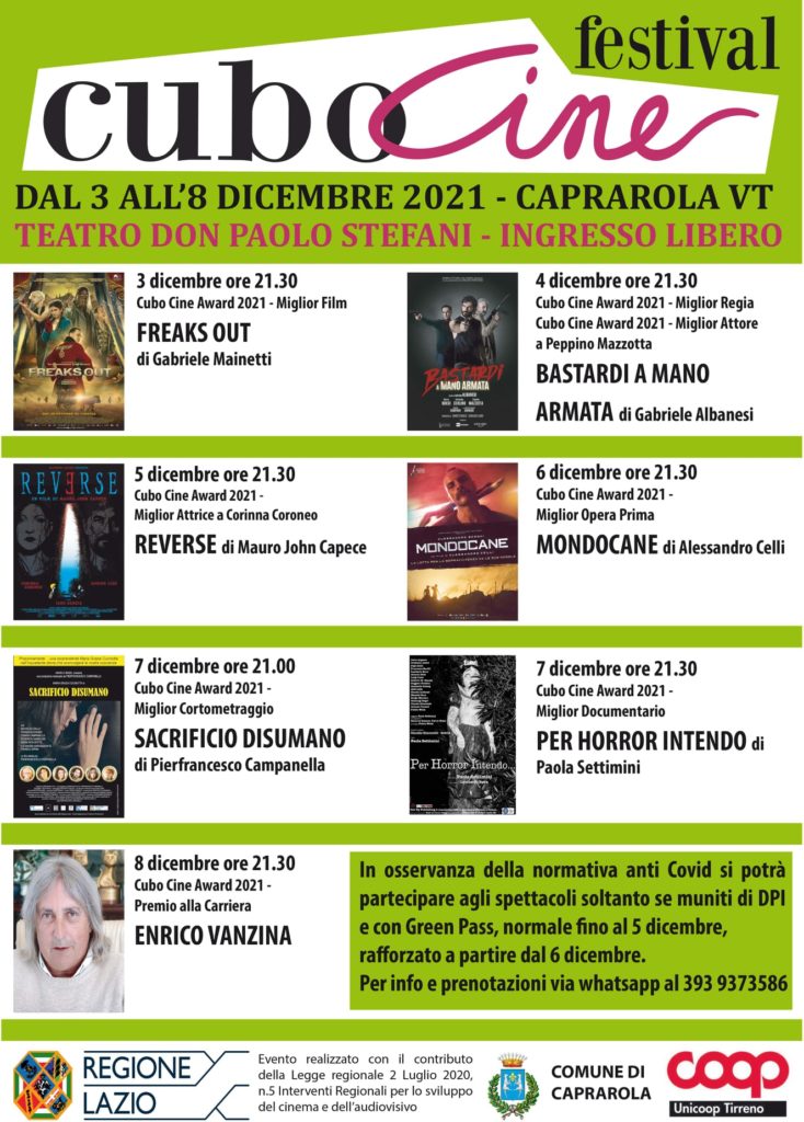 Con Cubo Cine Festival si arricchisce ulteriormente il calendario di eventi che si terranno a Caprarola durante tutto l’inverno. L’offerta si amplia di giorno in giorno, passando per l’importante stagione del Teatro Don Paolo Stefani che partirà a gennaio“. Così il sindaco di Caprarola, Angelo Borgna, commenta l’avvio della sesta edizione all’interno del decimo Cubo Cine FestivalCubo Cine Award, in programma presso il Teatro Don Paolo Stefani di Caprarola, dal 3 all’8 dicembre 2021, ma anche online tramite dirette streaming sulla pagina ufficiale e i canali social della manifestazione. Un evento realizzato con il contributo e il patrocinio del Comune di Caprarola e riconosciuto dalla Regione Lazio nell’ambito degli Interventi regionali per lo sviluppo del cinema e dell’audiovisivo.