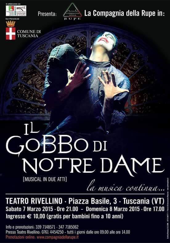 Nuovo doppio appuntamento per la Compagnia della Rupe che si esibirà sabato 7 Marzo ore 21 e Domenica 8 Marzo ore 17 al Teatro Rivellino (Tuscania – VT ) con il musical “Il Gobbo di Notre Dame”.