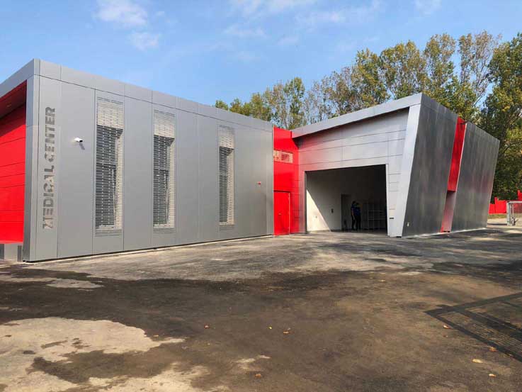 Il Medical Center, come spiega successivamente Angeli, era il requisito richiesto dalla federazione per consentire il ritorno della Formula 1 nel celebre autodromo della Ferrari. L’edificio, che sorge in un’area recintata di 2700mq, possiede strutture portanti in elevazione, travi e pilastri, interamente formate da calcestruzzo armato. La copertura, invece, è stata realizzata con pannelli in X-LAM di spessore variabile a seconda delle luci da superare. Al suo interno, oltre alle aree pubbliche trovano ubicazione le sale emergenza (ambulatori 2 e 3), la sala radiologia, lo spazio adibito alla degenza temporanea e l’uscita verso l’elisuperficie, per consentire un collegamento rapido verso gli ospedali.
