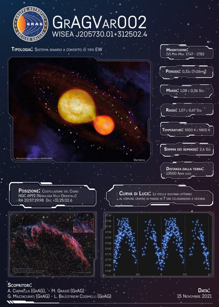 GrAGVar002 è il nome della stella variabile scoperta a Novembre 2021 dal comitato scientifico del Gruppo Astrofili Galileo Galilei. Si tratta di un sistema binario formato da due stelle a contatto tra loro nella costellazione del Cigno. Nell’ambito del loro programma di ricerca scientifica, gli astrofili del GrAG stavano analizzando la porzione di cielo che ospita Kelt-16b, un noto esopianeta gigante, che può essere studiato con la tecnica della fotometria. Esaminando altre stelle dello stesso campo hanno individuato la nuova stella variabile e ne hanno misurato la prima curva di luce che ha consentito di definirne le caratteristiche.
