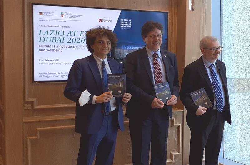 “Questo volume, commissionato alla Sandro Teti Editore, raccoglie i diversi aspetti che identificano la Regione Lazio a Dubai, con una programmazione in perfetta coerenza con il concept del Padiglione Italia. Nel testo, in più lingue, si approfondisce l’inquadramento geopolitico ed economico degli Emirati Arabi Uniti e dell’Area del Golfo con uno specifico focus sulla realtà laziale e sulle esperienze d’innovazione legate alla partecipazione all’Expo. Il libro contiene un’interessante analisi, curata da Fabio Indeo, a carattere antropologico, sociologico, economico e soprattutto geopolitico degli Emirati Arabi e di Dubai in particolare. La pubblicazione sviluppa inoltre un excursus divulgativo, curato da Sergio Bellucci, sul contributo concreto di idee e progetti attraverso cui la Regione Lazio contribuisce, in questa Esposizione Universale, all’immagine complessiva del Sistema Paese”. Ha dichiarato Quirino Briganti, responsabile “Expo 2020 Dubai” per la Regione Lazio.