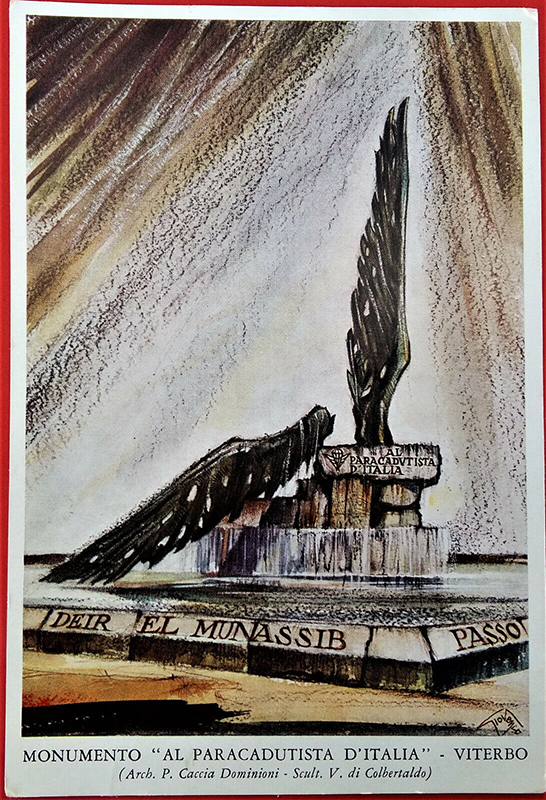 Ideata dall’Ingegnere  Paolo Caccia Dominioni, l’opera, in bronzo e peperino, è stata inaugurata nel 1966 e sorge in piazza dei Caduti. Le due ali ricordano, una il librarsi nell’aria e l’altra, spezzata, i caduti. È in ricordo delle divisioni paracadutisti Folgore e Nembo che nacquero a Viterbo e a Tarquinia nel 1940/41.Lasciato in penombra e spesso nell’ incuria la sua fontana è svuotata e spesso piena di rifiuti… è il monumento più grande di Viterbo.