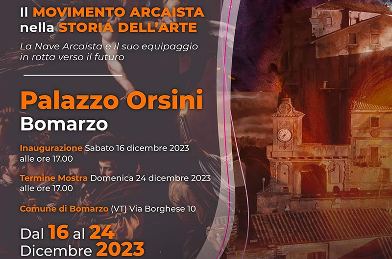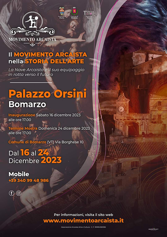 Il risultato di tale impegno rappresenterà ora il Movimento Arcaista nel mondo, partendo da una location strategica che ben si adatta alla fantasia di chi opera con vero talento e inventiva nel campo dell’arte e quindi dal prestigioso Palazzo Orsini di Bomarzo, in provincia di Viterbo, adiacente al celebre “parco dei mostri” (opera nel 1547 dell’artista Pirro Ligorio su richiesta del principe Pier Francesco Orsini), da sabato 16 a domenica 24 dicembre 2023, con il patrocinio della provincia di Viterbo e la partecipazione del Presidente Alessandro Romoli, il patrocinio del comune di Bomarzo e la partecipazione del Sindaco Marco Perniconi, il patrocinio di “Tuscia in fiore ETS”, il presidente Giulio Della Rocca e la direttrice artistica la professoressa Laura Principi, il presidente della “Viterbo Sotterranea” Sergio Cesarini.