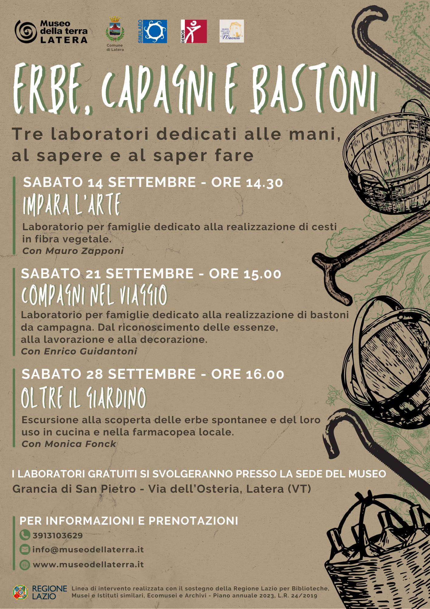 Sabato 14 settembre il Museo della terra di Latera inaugura un ciclo di laboratori pensati per le famiglie. Erbe, capagni e bastoni nasce dall’idea di valorizzare il patrimonio di competenze diffuse nel territorio nel quale il Museo di Latera è immerso. Un’iniziativa pensata per far rivivere i saperi e i saper fare di cui gli oggetti esposti lungo il percorso espositivo sono testimonianza. Alcuni di questi laboratori vedranno protagoniste le mani. In particolare i primi due, nel corso dei quali verrà data dimostrazione della realizzazione di cesti in fibra vegetale (che a Latera vengono comunemente chiamati “capagni”) e di bastoni da campagna. L’ultimo appuntamento invece sarà dedicato al riconoscimento delle erbe spontanee che la natura offre in questo periodo. Sarà anche l’occasione per raccontare di come queste risorse trovassero tradizionalmente impiego in cucina o in altri ambiti della vita quotidiana locale.