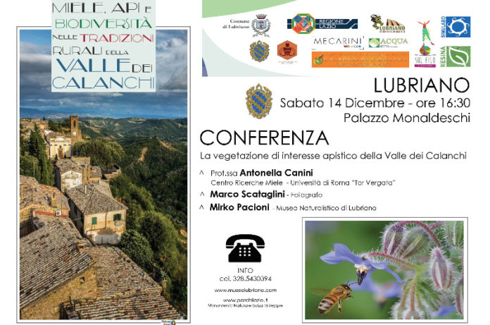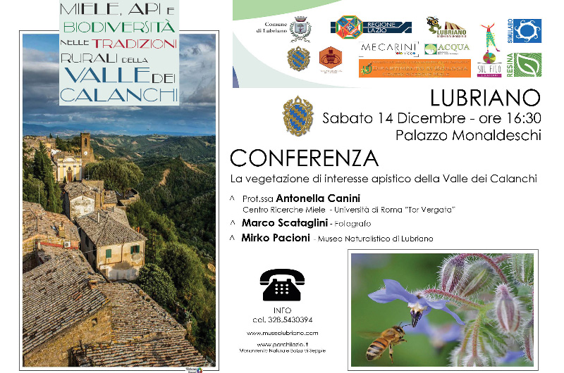Si comincia sabato 14 dicembre 2019 a Palazzo Monaldeschi, in piazza San Giovanni Battista n.1, alle ore 16:30 con la CONFERENZA dal titolo “La vegetazione di interesse apistico della Valle dei Calanchi”: ANTONELLA CANINI, docente e direttrice del Centro Ricerche Miele dell’Università di Roma “Tor Vergata”, entrerà nello specifico dei temi botanici; MARCO SCATAGLINI fotografo, svelerà i segreti delle foto macro. www.marcoscataglini.com MIRKO PACIONI, direzione tecnico-scientifica del Museo Naturalistico di Lubriano / Monumento Naturale “Balza di Seppie”, illustrerà le attività Scuola di Apicoltura dell’Etruria.