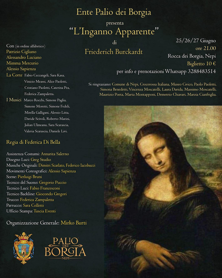 ” scherzo teatrale”ambientato all’interno della Corte di Lucrezia Borgia nel periodo in cui la duchessa, in lutto dopo l’uccisione del marito il Duca di Bisceglie, per mano di alcuni sicari del fratello Cesare, si ritirò nel castello di Nepi.