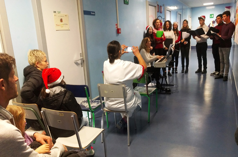 In un piccolo corridoio, dunque, i ragazzi del Liceo Musicale cittadino, in piena vacanza, ma con slancio generoso, hanno eseguito classici canti di Natale insieme a brani che andavano da un impegnativo repertorio rinascimentale, fino alle colonne sonore dei film di animazione. In un reparto commosso e attento, tutto ha contribuito a far vivere ai piccoli pazienti stupiti per la novità, una piena atmosfera natalizia come in nessun altro Concerto al di fuori di là.