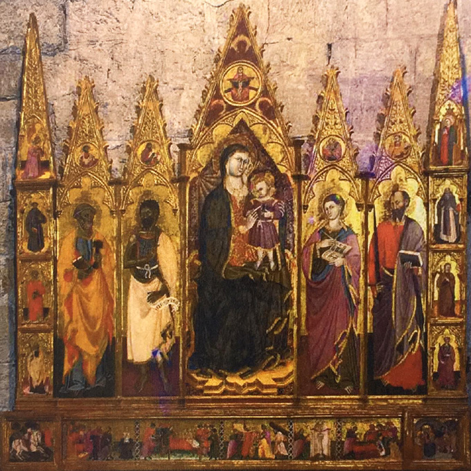 Si tratta di un’opera che nel corso del tempo ha subito vari restauri e perfino atti di vandalismo, si compone dall’assemblaggio di sette assi verticali e di una predella orizzontale. Gli elementi, disposti simmetricamente per ordine di larghezza dall’esterno verso il centro, sono suddivisi al loro interno in scomparti distinti, per un totale di 25 unità figurative. L’essenza impiegata è legno di pioppo. Il polittico mantiene gli originali assetti di incorniciatura, con cuspidi, trafori lobati, pinnacoli, colonnine divisorie, ancora in opera secondo la carpenteria di insieme. L’assemblaggio è garantito da un sistema di traversature orizzontali che attraversano l’intera struttura. Sui fondi campiti con doratura a bolo si stagliano le pitture eseguite a tempera all’uovo, ricche nella gamma cromatica, così come nella modalità di stesura. Sapiente l’uso di velature e sovrapposizioni trasparenti, elaborate con fine gusto calligrafico. Particolarmente raffinata è la tecnica con cui sono ese-guite le vesti in broccato ( comparto centrale con Madonna in trono ) che utilizza stratificazioni complesse di doratura a lamina metallica, meccatura, finitura pittorica, riporto di ornato a sgraffito e punzonatura finale . Si tratta di un linguaggio figurativo attardato allo stile tardogotico di ascendenza senese, più interessato all’equilibrio superficiale di linee e cromie che alla struttura prospettica dei volumi e della fonte di luce.