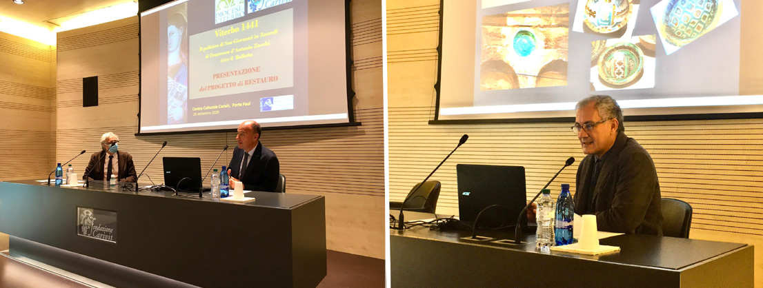 Un capolavoro del tardo gotico il Polittico di San Giovanni in Zoccoli di Francesco D’Antonio Zacchi detto il Balletta, (1441). Oggi 28 Settembre 2020 presso il Centro Culturale di Valle Faul di Viterbo la presentazione del progetto di Restauro che l’Ufficio Beni Culturali della Diocesi di Viterbo,  promuove, (presente l’Ing.Santino Tosini) grazie al finanziamento della Fondazione Carivit di Viterbo, il restauro del grande polittico di Francesco d’Antonio Zacchi, detto il Balletta ( 1441 ) , della Chiesa San Giovanni in Zoccoli, in Viterbo. L’intervento, affidato a Giorgio Capriotti, è sottoposto all’Alta Sorveglianza della Soprintendenza Archeologia , Belle Arti e Paesaggio per l’area metropolitana di Roma, la provincia di Viterbo e l’Etruria meridionale, rappresentata dalla d.ssa Federica di Napoli Rampolla. Il Polittico, dipinto a tempera su tavola (firmato e datato 1441) segue a due anni dal completamento del restauro sull’altro grande polittico viterbese del Balletta, nel Santuario di Santa Rosa, offrendo l’occasione per mettere a confronto studi e campagne diagnostiche mirate (a cura dell’Enea) e ad arricchire le conoscenze tecniche e storiche su un capitolo cruciale della pittura locale della metà del XV secolo.