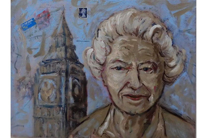 Francesco Guadagnuolo gli dedica un ritratto ad olio su tela alla grande Sovrana, a miticizzare la Sua vita e morte nella stessa opera artistica. Nel ritratto rivela la Regina segnata, sì dal tempo ma nobile nella sua solennità. Nell’opera Guadagnuolo ha inserito un francobollo che la raffigura quando 26enne, il 6 febbraio 1952, saliva al Regno. Così Guadagnuolo vuole fare osservare passato e presente che s’incontrano e segnano i 70 anni di Regno Unito come se tutto questo custodisse il vero stato d’animo della Sovrana. Nell’opera tempo e spazio non sono dimensioni disgiunte, ma fluenti uno nell’altro, interpretano artisticamente e catturano i caratteri somatici della Regina nell’avanzare del tempo. Un tempo, che sia umano, ma anche a volte soprannaturale e consequenziale, con l’intensità con cui lo spazio visivo è rivissuto e condiviso.