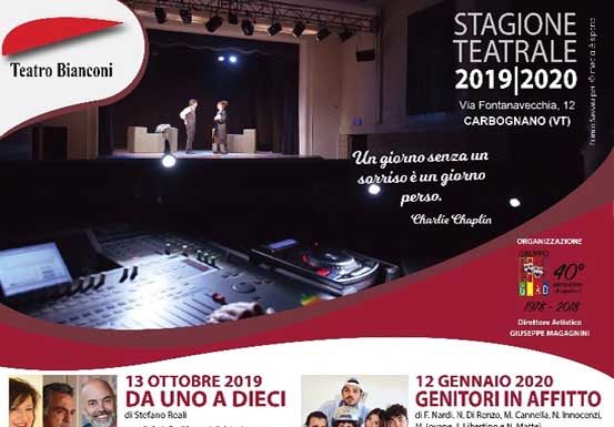 La Stagione 2019-2020 del Teatro Bianconi di Carbognano inizia domenica 13 ottobre alle ore 16.30 con una commedia brillante scritta da Stefano Reali che ne cura anche la regia : DA UNO A DIECI. Lo spettacolo vede ritornare sullo storico palcoscenico del teatro viterbese tre grandi protagonisti del teatro nazionale già ben noti al pubblico del Bianconi: Gabriella Silvestri, Fabio Avaro e Antonio Conte accompagnati per l’occasione anche da Vincenzo De Luca e Alessandra Palazzoli.