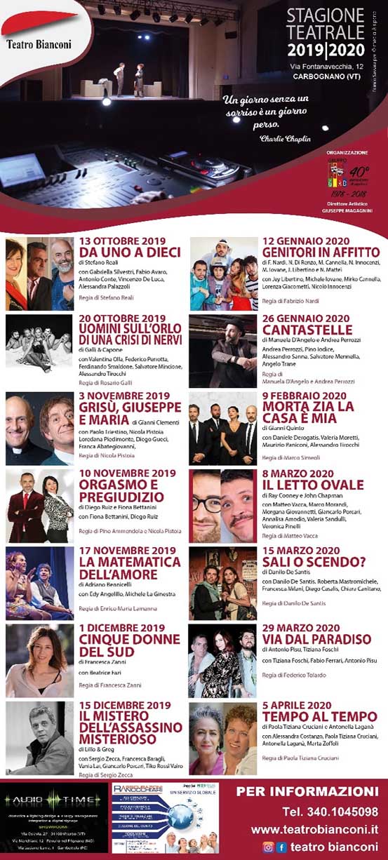 Una scelta altissimo livello per il debutto dell’ennesima grande Stagione del Teatro Bianconi che non mancherà anche quest’anno di divertire e non deludere le altissime aspettative di un pubblico sempre più numeroso, attratto dalle nuove 14 proposte del cartellone divise tra grandi ritorni e stuzzicanti debutti, sempre all’insegna del sorriso e dell’alta qualità dei testi, dei protagonisti e degli allestimenti.