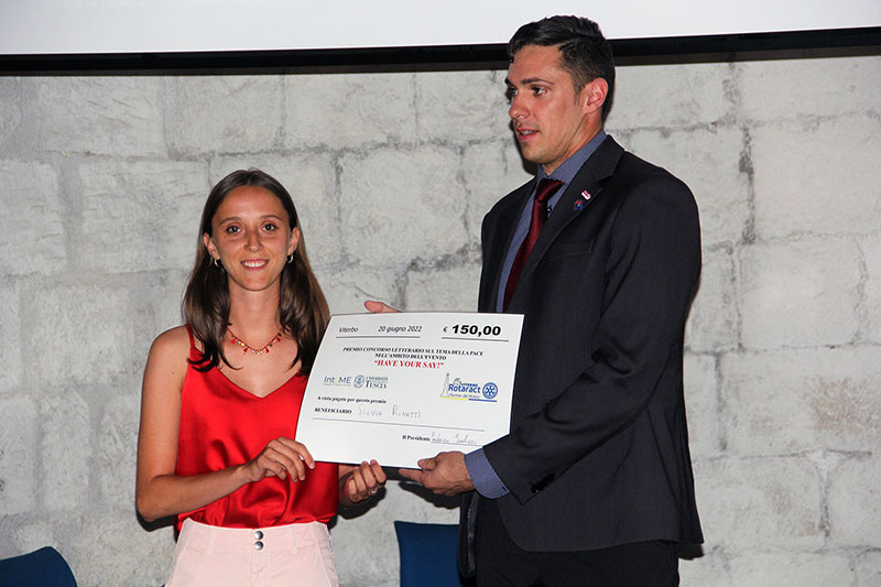 La fase dedicata agli studenti è stata aperta da Daniela Vitiello, Ricercatrice di diritto dell’Unione, Progetto IntoME, Università della Tuscia, che non ha nascosto la soddisfazione: “Esprimo grande entusiasmo per l’adesione da parte delle associazioni studentesche a questo progetto di scrittura artistico e grazie al Rotaract e al Rotary club Viterbo, promotori di questo concorso, che permette di premiare studenti che si sono cimentati in scritti sul tema della pace”.