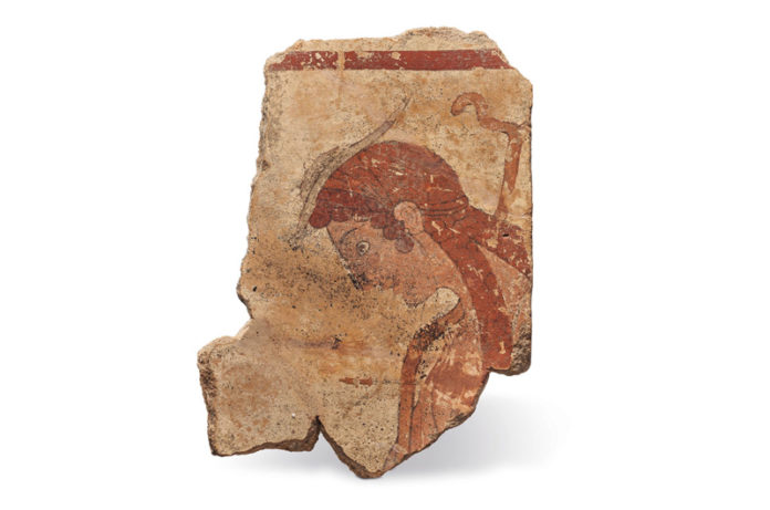Il frammento appare ora in pubblico in una nuova veste, dopo uno speciale intervento di conservazione da parte del restauratore Antonio Giglio, che ha riportato in luce la policromia e i raffinati dettagli della figura. Si tratta di un giovane di profilo dalla ricca acconciatura composta da riccioli bruni sulla fronte e da robuste trecce rossicce che ricadono sulle spalle. Sul capo indossa un piccolo cappello a tesa, tipico dei viaggiatori dell’antichità e in mano tiene un lungo e sinuoso bastone forcuto. “È probabile che sia una scena tratta dal mito” commenta Daniele F. Maras, funzionario archeologo della Soprintendenza “Diversi personaggi del mito sono raffigurati in veste di viaggiatori, da Teseo a Edipo. Ma non si può escludere che il giovane dipinto sulla lastra sia in realtà un attore impegnato in una performance rituale”.