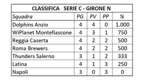 Le altre partite del girone hanno visto l’Anzio superare il Napoli 13 a 1 al 7° inning, mentre Latina e Salerno non hanno giocato per impraticabilità del campo.