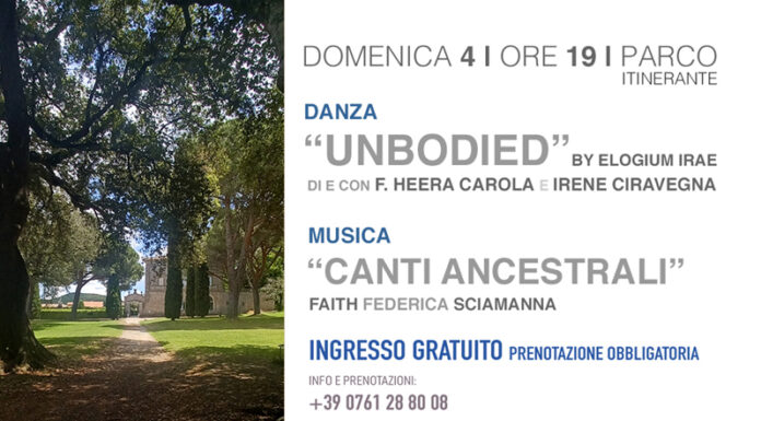 Domenica 4 sempre alle ore 19, ultimo appuntamento con “Unbodied” by elogium irae di e con F. Heera Carola E Irene Ciravegna e i “Canti Ancestrali” di Faith, Federica Sciamanna. Una performance itinerante creata appositamente per il Festival. Una combinazione tra teatro danza e musica. Gli artisti si alterneranno accompagnandoci in un percorso intimo all’interno del parco dove la relazione e la disponibilità dei corpi diventa veicolo comunicativo. Elogium irae è un progetto collaborativo nato da Franco Heera Carola e Irene Ciravegna nel 2000, curatori di numerosi allestimenti per la lirica, sfilate di moda, teatro e cinema. Nel 2002 vincono il premio internazionale Coreografie d’Autore.