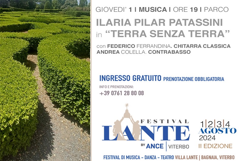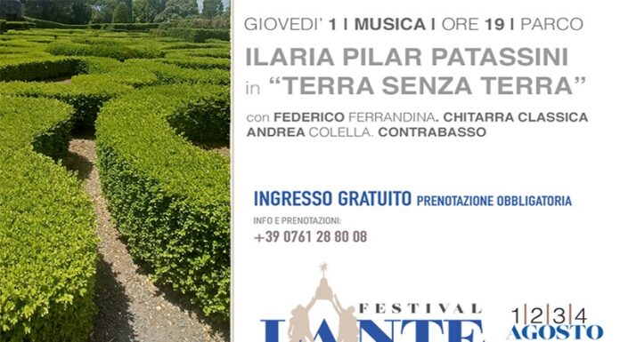 Festival Lante si aprirà giovedì 1 agosto alle ore 19, nel parco, con il concerto di Ilaria Pilar Patassini “… Terra senza Terra“, accompagnata da Federico Ferrandina alla chitarra classica e da Andrea Colella al contrabbasso. Pilar presenta il live del suo ultimo album muovendosi tra canzone d’autore, jazz, world music ed incursioni nel mondo della musica classica. Parallelamente alla sua attività di cantautrice porta avanti importanti progetti da interprete, collabora con il direttore d’orchestra britannico e produttore Geoff Westley ed il regista Peppe Servillo. È docente di “Interpretazione della Canzone d’autore italiana e internazionale” presso l’Accademia di Alta Formazione “Officina Pasolini” di Roma.