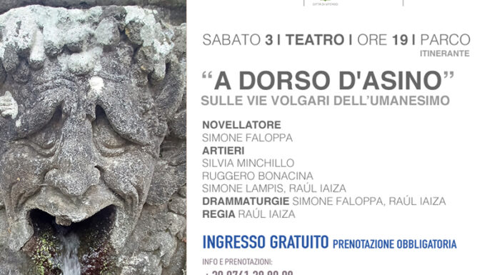 Sabato 3 alle ore 19 nel parco si terrà lo spettacolo itinerante, in 7 stazioni, di Raul Iaiza, “A dorso d’asino” sulle vie volgari dell’umanesimo, che vede come novellatore: Simone Faloppa; gli artieri: Silvia Minchillo, Ruggero Bonacina, Simone Lampis e Raúl Iaiza; drammaturgie di S. Faloppa e R. Iaiza e la regia di R. Iaiza.