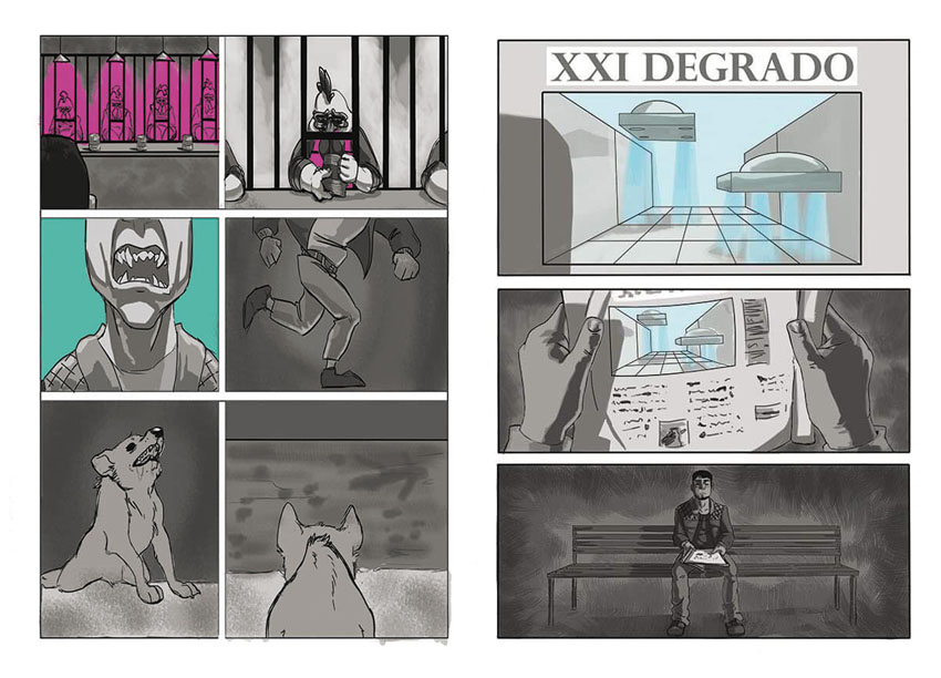 XXI° Degrado è un racconto di denuncia, che senza parole e con immagini forti e amaramente surreali, ci descrive un bestiario di categorie di umani degenerati, inseriti in una società distopica dove nell’amaro finale, l’Uomo involve e si trasforma in iena.Un racconto per immagini reso con grazia e virtuosismo dalle giovani matite dei ragazzi del Liceo di Vignanello.L’ urlo disegnato, disperato e forte del gruppo di studenti diventa ribellione muta e incisiva dello stato di un mondo nel quale i ragazzi si trovano ad affrontare le sfide di una società che sembra sorda e muta nei confronti delle urgenze politiche, etiche e ambientali che gli adulti sembra si stiano dimenticando di volere affrontare.