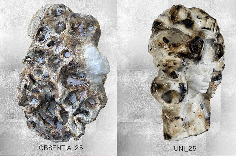 Per questa edizione, Morzetti propone quindi un percorso scultoreo articolato attorno a un grande tema: la cura del sé come percorso di conoscenza, come viaggio interiore che affonda le radici tanto nell’introspezione contemporanea quanto nella mitologia Etrusca e Classica, tradizioni che l’artista conosce intimamente grazie alla sua formazione biografica e culturale a Tuscania, terra di necropoli, divinità arcaiche, riti della trasformazione e continui dialoghi tra visibile e invisibile. In questa cornice, il nucleo di opere presentate – OBSENTIA_25, BONADEA_25, UNI_25, VOLTUMNA_25, SATIVA_25, MORFEA_22, SELFIE_22, MIRROR_22 – diventa una costellazione di presenze simboliche che richiamano riti antichi, genealogie divine, archetipi mediterranei e tensioni interiori che attraversano il tempo.
