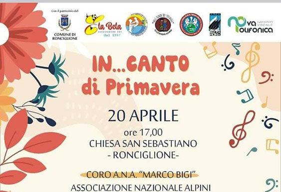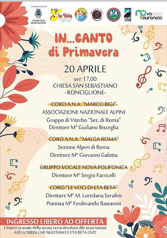 Un pomeriggio davvero indimenticabile quello vissuto sabato scorso presso la chiesa di S. Sebastiano a Ronciglione: 4 formazioni corali hanno dato il loro artistico contributo per un concerto applauditissimo. Organizzato dalle Associazioni Eta Beta e Gli Anni in Tasca col Patrocinio del Comune di Ronciglione, In…Canto di Primavera, come è¨stato intitolato, ha rappresentato un momento di interessante scambio artistico- culturale nella cornice di un intenso, squisito calore umano. Ha esordito il Gruppo Vocale Nova Polifonica, diretto da Sergio Farricelli, nel suo pubblico, incoraggiante debutto, proponendo eccellenti pagine di raffinata polifonia. A seguire due Cori Alpini: il Coro A.N.A. Malga Roma, diretto da Giovanni Galotta e il Coro dell’ Associazione Nazionale Alpini Marco Bigi, sotto la direzione di Giuliano Bisceglia. Gli spettatori hanno potuto partecipare delle forti suggestioni del repertorio di queste 2 corali, tra aneliti appassionati e robusti scenari di montagna. La conclusione del concerto, infine, è¨stata affidata al fiore all’ occhiello dell’ Associazione Eta Beta, il Coro Integrato Le Voci di Eta Beta, nato, forgiato e diretto dalla formidabile esperienza didattica di Maria Loredana Serafini. I ragazzi, supportati da alcuni volontari, hanno profumato di magiche note la meravigliosa navata della chiesa, cantando con attenta, pulita dizione ed intonazione e con tanto, tanto cuore. La serata ha avuto termine con l’ Inno di Mameli, cantato dall’insieme di tutte le corali partecipanti, in un tripudio di euforico entusiasmo. Ha accompagnato il concerto il pianista Ferdinando Bastianini.