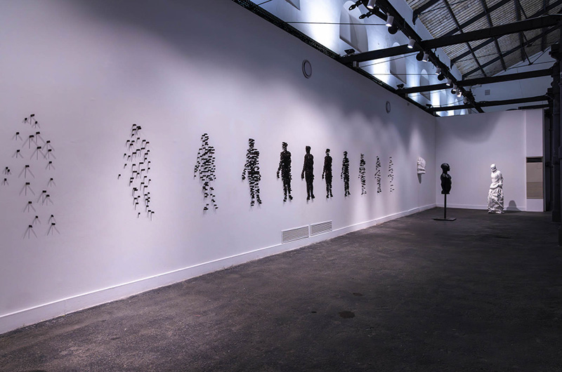 Il percorso espositivo si apre con due sculture in ebano entrambe raffiguranti un volto, in un caso, Rifugiato gravità, scomposto in una miriade di frammenti, in parte mappati e fatti ‘esplodere’ a parete, e nell’altro sezionato in due metà, Per la distruzione che un giorno verrà. Al centro del Padiglione si trova una grande scultura magnetica A tree man, con un’anima in legno avvolta da una rete metallica su cui sono fissati migliaia di piccolissimi magneti, la cui funzione è trattenere la polvere di ferro e titanio che ricopre l’intera figura. Nell’ultima sala è presente invece una serie di lavori raffiguranti teste e visi realizzati in vetrofusione, sculture bicrome ben definite nelle forme, ma volte a restituire uno stato di passaggio tra il solido e il liquido. Chiude la mostra la sala dedicata a bozzetti, modellini, diari, matrici e prove di stampa dell’artista, offrendo così ai visitatori la possibilità di abitare lo studio dell’artista rintracciandone le varie fasi creative attraverso la percezione diretta dei materiali e delle tecniche impiegate nei diversi momenti di creazione del suo lavoro.