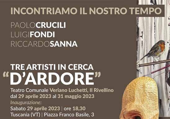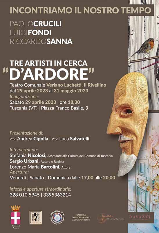 Con il patrocinio del Comune di Tuscania, presso il Teatro Comunale Veriano Luchetti “Il Rivellino” sabato 29 aprile, alle ore 18.30, verrà inaugurata la mostra di pittura e scultura dei maestri Paolo Crucili, Luigi Fondi e Riccardo Sanna del gruppo d’arte Incontriamo il Nostro Tempo.