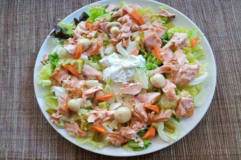 Scottare velocemente il salmone in una padella unta di burro e lasciarlo raffreddare. Accomodare l’insalata, il finocchio, la carota affettata, l’avocado tagliato a cubetti e i funghi in un piatto, lasciando un vuoto al centro dove porrete la salsa ottenuta mescolando tutti gli ingredienti che la compongono. Spezzettare sull’insalata il salmone e servire.