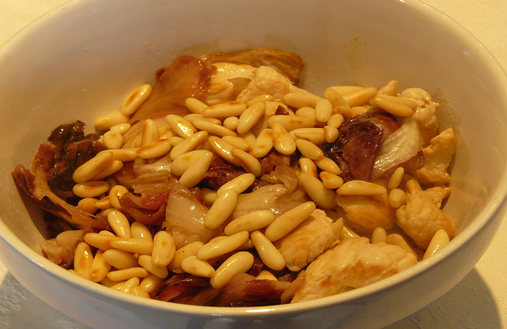 Lavare l’insalata poi tagliarla a listarelle sottili; dopodiché tagliare a straccetti il petto di pollo e scottarlo in padella con sale e olio. Tagliare il pane a cubetti e rosolalo in un tegame con olio e finocchietto selvatico finché non risulterà dorato. Preparare un’emulsione di olio, sale e pepe nero macinato per condire. Mettere l’insalata in un piatto piano, sopra gli straccetti di pollo e il pane croccante, aggiungere la burrata e completare con l’emulsione di olio; infine, cospargere con i pinoli e il finocchietto selvatico.