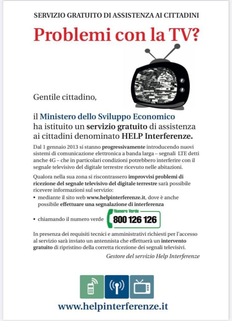 Si chiama Help Interferenze il servizio gratuito di assistenza ai cittadini, istituito dal ministero dello Sviluppo economico, in caso di disturbi alla tv digitale terrestre, dovuti alle interferenze tra i segnali LTE (detti anche 4G) e quelli televisivi. In caso di disturbi nella ricezione della TV digitale terrestre, l’utente privato o l’amministratore di un condominio può effettuare – tramite le modalità web e numero verde – una segnalazione a Help Interferenze. In presenza di requisiti tecnici e amministrativi richiesti per l’accesso al servizio, senza alcun costo per il cittadino, sarà inviato un antennista che effettuerà l’intervento di ripristino della corretta ricezione dei segnali televisivi. Il servizio è dedicato a tutti i cittadini che a partire dal 1 gennaio 2013 riscontrano problemi di ricezione di uno o più canali o l’oscuramento totale della propria tv. Il problema riguarda solo la tv digitale terrestre, mentre non colpisce la televisione satellitare. Il servizio è stato affidato alla Fondazione Ugo Bordoni, ente terzo e indipendente, che opera sotto la supervisione del ministero dello Sviluppo economico – Dipartimento per le comunicazioni.