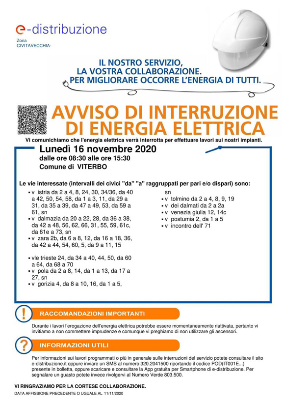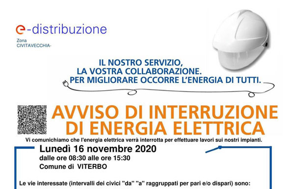 Lunedi 16 novembre prossimo dalle ore 8.30 alle ore 15.30 viene comunicata la interruzione di energia elettrica nel comune di Viterbo, specificamente al quartiere Ellera.