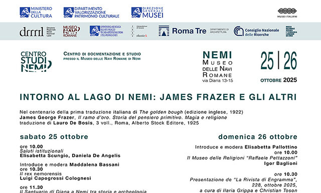 Nel centenario della prima traduzione italiana di The Golden Bough (1925), il Centro di Documentazione e Studio di Nemi organizza un convegno interdisciplinare che riunisce studiose e studiosi italiani e internazionali là dove il mito del rex nemorensis continua a interagire con il presente. Due giornate di studi e incontri per riscoprire la potenza simbolica del lago di Nemi e l’eredità di James G. Frazer: tra antropologia, storia delle religioni, archeologia, arte e letteratura. Il convegno sarà ospitato dal Museo delle Navi Romane di Nemi afferente alla Direzione regionale Musei nazionali Lazio.