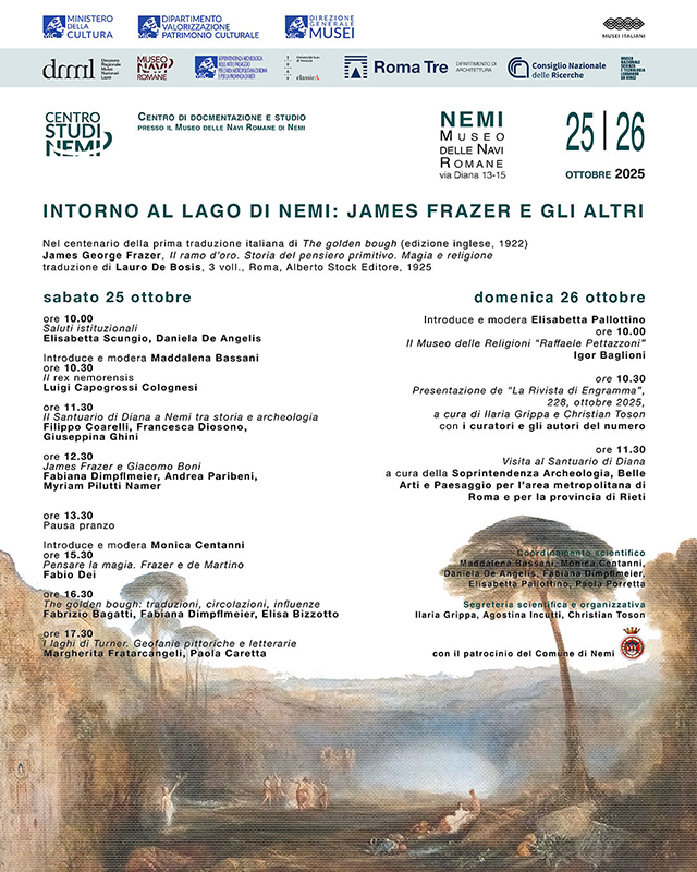 Il programma intreccia lezioni, conversazioni e visite, ricostruendo i fili che legano il Santuario di Diana, il rex nemorensis, le traduzioni e le circolazioni del Ramo d’oro, fino alle geofanie pittoriche e letterarie dei laghi di Turner. Dalla ricerca d’archivio alla narrazione pubblica, il convegno mostra come l’opera di Frazer – e gli studi di Boni e de Martino – continuino a generare nuove letture del paesaggio culturale di Nemi.