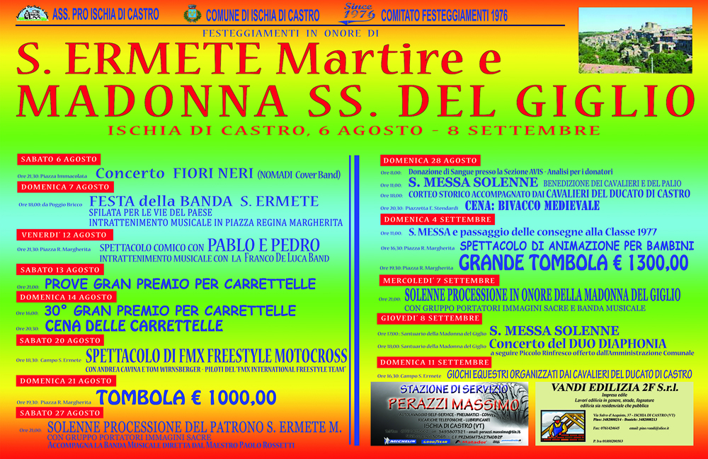 In occasione dei festeggiamenti per il Patrono Sant’Ermete e della Madonna SS del Giglio, saranno tanti gli eventi che si susseguiranno ad Ischia di Castro dal 20 agosto all’11 settembre 2016.