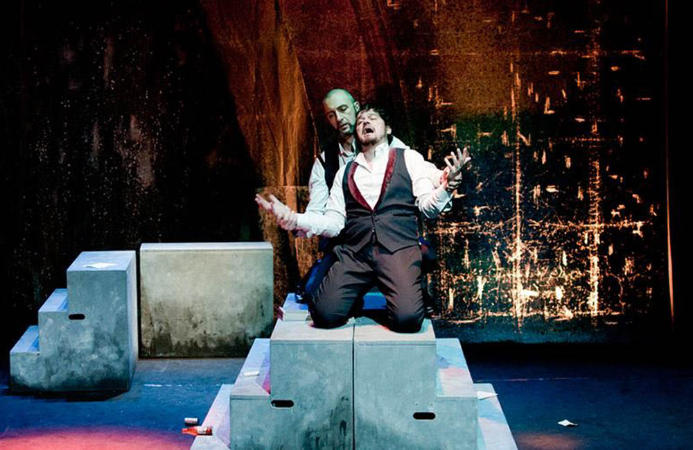 La messa in scena di Marco Maccieri e Angela Ruozzi utilizza un linguaggio caratterizzato da luci teatrali, videoproiezioni e musica dal vivo che insieme restituiscono allo spettatore un percorso allucinatorio in cui sono immersi i protagonisti: le scenografie di Antonio Panzuto aiutano in quest’immersione, toccando linguaggi pittorici del naturalismo fino al surrealismo di Escher. Un mondo di grandi ombre e grandi luci che ritroviamo, grazie al lavoro drammaturgico di Emanuele Aldrovandi, nel personaggio di Jekyll, normale cittadino inglese di fine ‘800 che si interroga sul dualismo coesistente di bene e male.