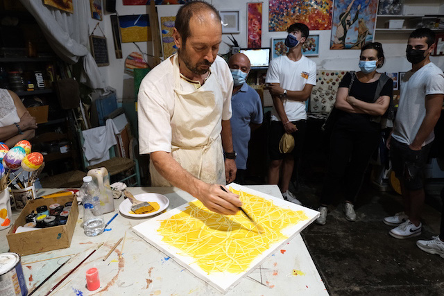 Bernardino Balzi artista ci attende nella sua bottega tra i vicoli di Blera, un passato da giramondo tipico della sua generazione che ha contestato tutto e a suo modo si è disegnato una vita, la sua. Nella sua pittura usa materiali naturali che raccoglie nei campi o oggetti di riuso che la società scarta, come quel leone disegnato su una parabola della televisione satellitare. Usa le terre come gli antichi Etruschi o le sabbie dei deserti, che gli amici gli portano al ritorno dai loro viaggi, che trasforma in tinture per i quadri. Ma la sua creatività non ha fine e ci fa bella mostra ed assaggio del formaggio che produce, grazie al suo passato da da pastore per cui ha imparato a conciare il pellame e oggi anche a dipingerci sopra, come si fa su una tela.