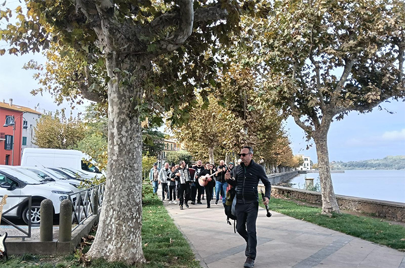 “Il bello della carovana è letteralmente ‘incontrare’ questi borghi della Tuscia – sottolinea Gregori -, tutti bellissimi, inoltrandosi in percorsi storici, campagne e boschi, arrivando sempre al contatto umano, incrociando  personaggi particolari che ci raccontano storie. A Capodimonte un signore ci ha accompagnato per tutto il lungolago parlando dei suoi ricordi sulla pesca delle anguille, a Marta un altro signore ha notato gli strumenti e ci ha arricchito camminando con noi mentre intonava un canto dedicato al paese. Siamo stralunati, è il nostro stile, e tanta gente si avvicina per conoscerci, mostrando tanta curiosità. I concerti poi sono andati benissimo, le persone vengono ad ascoltarci, che sia all’esterno, come è accaduto in riva al lago, che al chiuso, al Bistrot del Teatro San Leonardo, durante la tappa nel capoluogo”.