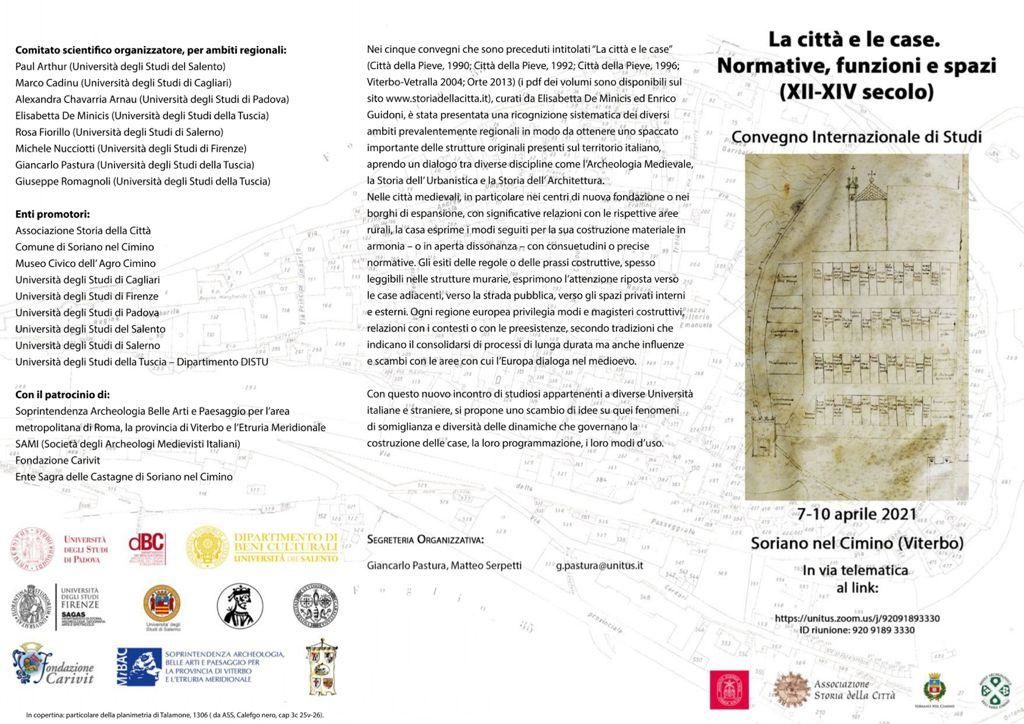 La città e le case. Normative, funzioni e spazi (XII- XIV secolo) promosso dall’Università della Tuscia (DISTU), l’Associazione Storia della Città ed il Comune di Soriano nel Cimino (Vt) e del Museo Civico dell’Agro Cimino, con il patrocinio della Soprintendenza Archeologia Belle Arti e Paesaggio per la provincia di Viterbo e l’Etruria Meridionale, della SAMI (Società degli Archeologi Medievisti Italiani), della Fondazione Carivit e dell’ Ente Sagra delle Castagne di Soriano nel Cimino.