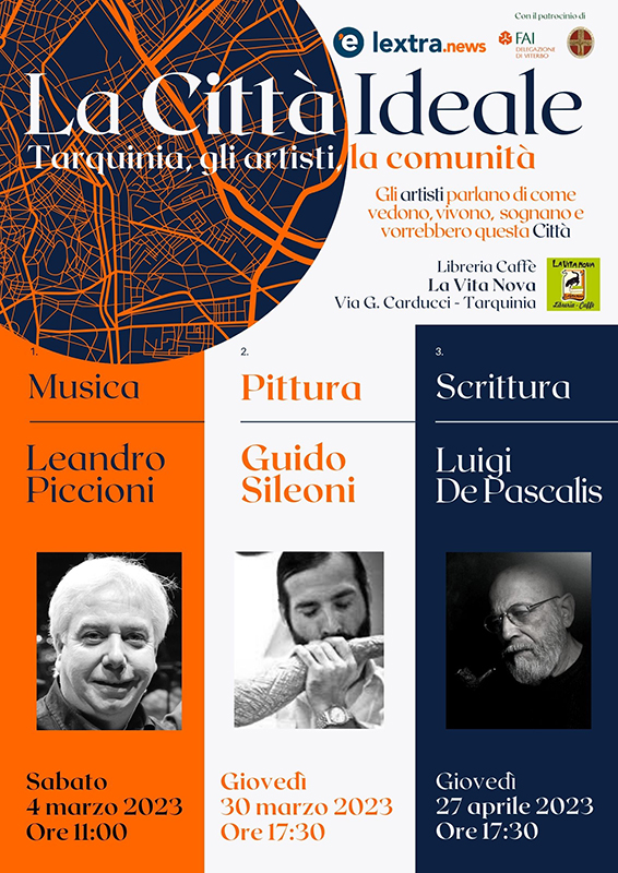 Un ciclo di incontri, una serie di chiacchierate con gli artisti che vivono Tarquinia per parlare di come vedono e sognano questa città: si avvia a inizio marzo un progetto promosso da lextra.news, con il patrocinio del FAI – Fondo Ambiente Italiano e della Società Tarquiniense d’Arte e Storia, che avrà come scenario la libreria caffè La Vita Nova.