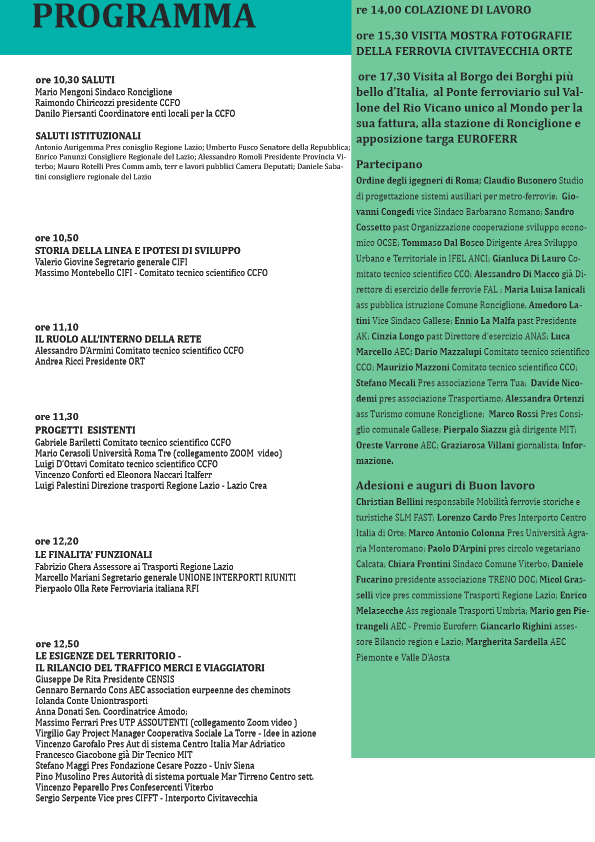 Il Convegno è proposto in collaborazione con il Collegio degli ingegneri ferroviari italiani (CIFI), il Comune di Ronciglione, l’Osservatorio regionale sui trasporti del Lazio ORT.