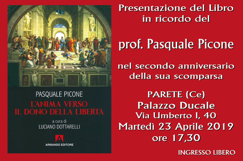 Nella prestigiosa sede del Palazzo Ducale di Parete in provincia di Caserta , luogo in cui era nato si è svolto Martedì 23 aprile, un incontro per ricordare la personalità e l’opera di Pasquale Picone viterbese d’adozione scomparso a soli 65 anni due anni or sono, prendendo spunto anche dalla pubblicazione, per i tipi di Armando Editore, del libro L’anima verso il dono della libertà.
