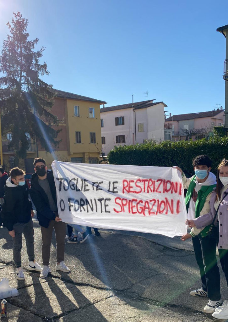 l’ennesima opportunità per non avere fiducia nelle istituzioni.” Anche all’Orioli di Viterbo, il Rappresentante d’Istituto Stefano Maggini, oggi a protestare con i suoi studenti, sostiene: “Vogliamo lasciare un segno, evidenziare questo sistema paradossale: stato di emergenza eliminato, discoteche aperte, mascherine all’esterno abolite, ma doppi turni di ingresso perenni”. Aggiunge il Rappresentante d’Istituto dell’Agosti Giacomo Cavalloro: “Ci sentiamo presi in giro, perciò oggi l’Agosti crede in questa causa ed è pronto a fare altre proteste se la situazione non si risolverà, qualcuno deve ascoltarci”.